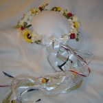 A floral crown of silk sunflowers, ivory and pale yellow wildflowers, blossoms, and tiny deep red rose buds, accented with green leaves, little sprigs of pearl beads and sparkling crystals.
