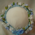 "Summer lake brings thoughts of a cool shimmering pool on a warm summer day. Light and medium blue and white roses with a string