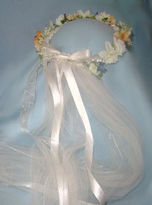 Ribbons of white and very soft light lavender in satin and sheer, are accented with a shaded stem green ribbon. Ribbons are tied in back in a bow with long flowing ribbon tails resting on a white hip length veil in back.